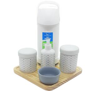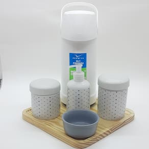 Kit higiene Poá 6 pçs - Molhadeira Cinza - Garrafa 500ml - Porcelana Peças muito resistentes, feitas com esmalte queimado em alta temperatura. Peças para armazenamento de cotonetes, algodão, água, etc. Os decalque são aplicados e queimados junto à peça, o que os funde a peça, dão brilho e não desbotam com o tempo. Dimensões (AxL): Pote Maior 9cm x 8,5cm, capacidade de 400 ml. Pote Menor 7cm x 9cm, capacidade de 250 ml. Porta sabonete Liquido/álcool gel: capacidade 300ml Molhadeira Cinza: 120ml Garrafa térmica: 500ml Bandeja de pinus (CxLxA): 25cm x 25cm x 1,7cm OBS: Por se tratar de madeira de pinus natural, pode existir pequenas variações na tonalidade das cores da madeira. A tampa é apenas colocada por cima, sendo assim não oferece nenhuma trava de vedação. As peças podem sofrer pequenas alterações de tonalidade devido a diferentes lotes de queima Embalagem contem 6 peças Marca: Antilope Decor Porcelanas