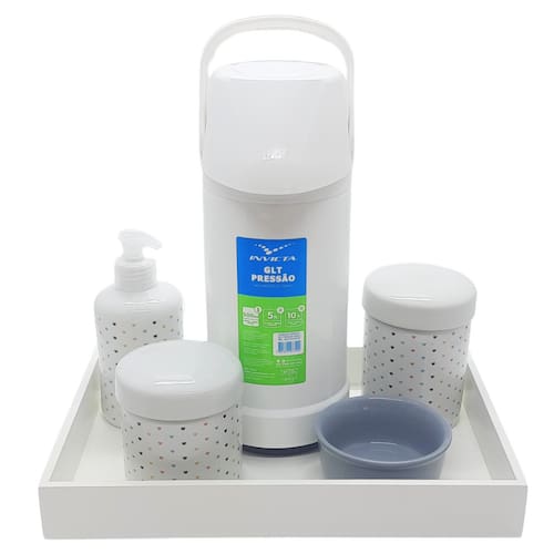 Kit higiene Poá 6 peças Porcelana - Bandeja Branca - Molhadeira Cinza Peças muito resistentes, feitas com esmalte queimado em alta temperatura. Peças para armazenamento de cotonetes, algodão, água, etc. Os desenhos são decalque aplicados e queimados junto à peça, o que os funde a peça, dão brilho e não desbotam com o tempo. Dimensões (AxL): Pote Maior 9cm x 8,5cm, capacidade de 400 ml. Pote Menor 7cm x 9cm, capacidade de 250 ml. Porta sabonete Liquido/álcool gel: capacidade 300ml Garrafa térmica; Capacidade 500ml Molhadeira: Capacidade 120ml Bandeja: (AxLxC) 3,5cm x 20cm x 34,5cm OBS: A tampa é apenas colocada por cima, sendo assim não oferece nenhuma trava de vedação. As peças podem sofrer pequenas alterações de tonalidade devido a diferentes lotes de queima Embalagem contem 6 peças