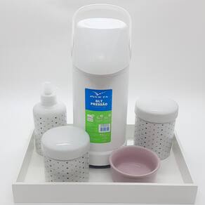 Kit higiene Poá 6 peças Porcelana - Bandeja Branca - Molhadeira Rosa Peças muito resistentes, feitas com esmalte queimado em alta temperatura. Peças para armazenamento de cotonetes, algodão, água, etc. Os desenhos são decalque aplicados e queimados junto à peça, o que os funde a peça, dão brilho e não desbotam com o tempo. Dimensões (AxL): Pote Maior 9cm x 8,5cm, capacidade de 400 ml. Pote Menor 7cm x 9cm, capacidade de 250 ml. Porta sabonete Liquido/álcool gel: capacidade 300ml Garrafa térmica; Capacidade 500ml Molhadeira: Capacidade 120ml Bandeja: (AxLxC) 3,5cm x 20cm x 34,5cm OBS: A tampa é apenas colocada por cima, sendo assim não oferece nenhuma trava de vedação. As peças podem sofrer pequenas alterações de tonalidade devido a diferentes lotes de queima Embalagem contem 6 peças