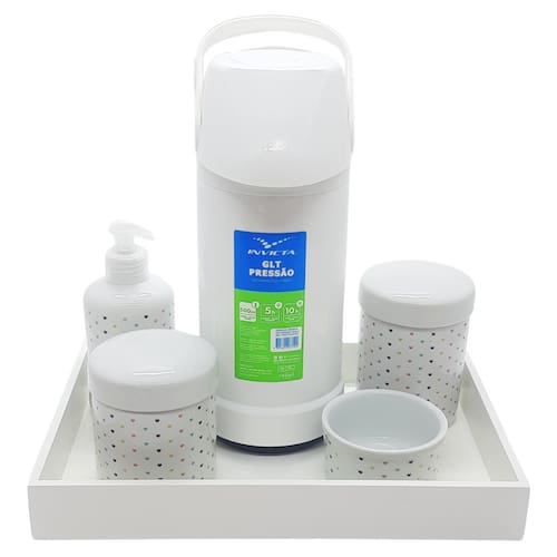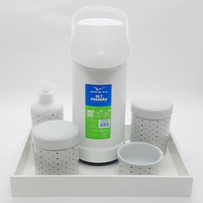 Kit higiene Poá 6 peças Porcelana - Bandeja Branca - Molhadeira Poá Peças muito resistentes, feitas com esmalte queimado em alta temperatura. Peças para armazenamento de cotonetes, algodão, água, etc. Os desenhos são decalque aplicados e queimados junto à peça, o que os funde a peça, dão brilho e não desbotam com o tempo. Dimensões (AxL): Pote Maior 9cm x 8,5cm, capacidade de 400 ml. Pote Menor 7cm x 9cm, capacidade de 250 ml. Porta sabonete Liquido/álcool gel: capacidade 300ml Garrafa térmica; Capacidade 500ml Molhadeira: Capacidade 120ml Bandeja: (AxLxC) 3,5cm x 20cm x 34,5cm OBS: A tampa é apenas colocada por cima, sendo assim não oferece nenhuma trava de vedação. As peças podem sofrer pequenas alterações de tonalidade devido a diferentes lotes de queima Embalagem contem 6 peças