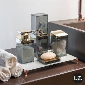 Kit Higiene Slim para Banheiro 4Pç Com Porta Escova Uz Dourado Kit Higiene Slim 4 Peças Para Banheiro Com Porta Escova Sabonete Líquido Porta Algodão E Saboneteira UZ A UZ oferece lindos kits com embalagens especiais, perfeitos para a sua casa. O Kit higiene UZ é produzido com plástico Poliestireno Cristal e pigmentos de coloração sólida , que é super resistente e durável e é ótimo para deixar seu banheiro lindo. Além de design arrojado, os produtos UZ possuem superfície interna lisa que facilita a lavagem. São fabricados em material altamente resistente. A UZ Utilidades é uma marca especialista em produtos que atendem as necessidades do consumidor, aliando funcionalidade e versatilidade. As linhas Servir, Organizar, Higienizar, Baby e Decorar foram pensadas para garantir mais praticidade ao dia a dia e uma casa muito mais completa. O Kit Banheiro Premium possui um design moderno e arrojado, ideal para organizar e deixar o seu banheiro cheio de estilo. É produzido em material transparente que garante a elegância do produto, além de facilitar a visualização do conteúdo interno. O KIT ACOMPANHA:01 unidade Porta Algodão Premium 13,3 cm x 8,0 cm x 8,0 cm01 unidade Porta Sabonete Líquido Premium 15,8 x 8,0 x 8,0 cm01 unidade Saboneteira Premium 2,3 cm x 10,8 cm x 10,8 cm01 unidade Porta Escova com Tampa Premium 23,0 x 8,0 x 8,0 cm INFORMAÇÕES:Origem: NacionalTipo: Kit Banheiro Premium Marca: Uz UtilidadesModelo: SlimReferência: UZ538-BRMaterial/composição: Poliestireno Cristal e pigmentos de coloração sólida CARACTERÍSTICAS:TransparênciaMaterial 100% reciclável e atóxicoAltamente resistente. Informações: Lavar com Sabão neutroResiste a mudança de temperaturaAlta resistência a impactosParede com espessura reforçada Recomendações e Orientações:Antes da primeira utilização, lave e seque bem as peçasPara limpeza, use somente esponja macia e detergente neutroNão utilize materiais abrasivosCom o uso, é normal que apareçam riscos tanto interno quanto externoPara descarte dos produtos e embalagens siga as orientações de reciclagem vigentes
