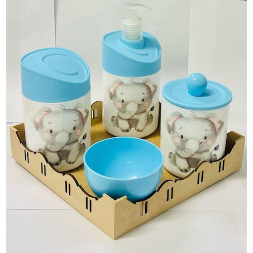 Kit Organizador para bebê c/bandeja em MDF. Cor do Pote: BRANCO PADRÃO Tampas: AZUL MATERIAL DOS POTES: ACRÍLICO MATERIAL DA BANDEJA: MDF Kit acompanha: - 1 bandeja de madeira em MDF. - 1 porta sabonete / álcool gel - 1 molheira - 1 porta algodão - 1 porta cotonete MEDIDAS DA BANDEJA EM MDF: Diâmetro: 19,5x19 cm Altura: 5x8cm MEDIDA DOS POTES: Porta algodão/cotonete: 8x10,5 cm Porta sabonete líquido: 12x21 cm Molheira: 8x5 cm Marca: Doya Kids
