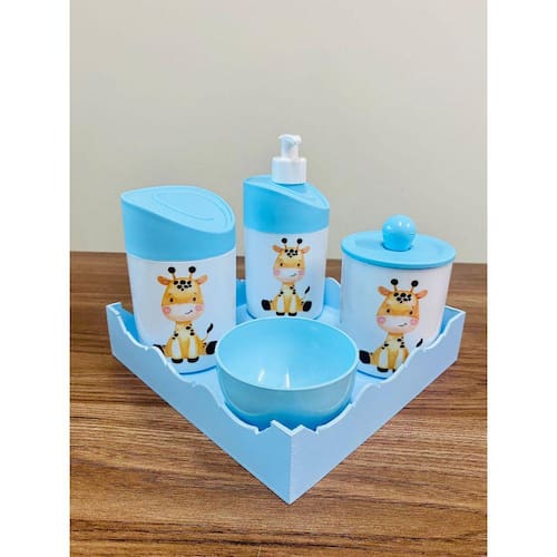 Kit Organizador para bebê c/bandeja em MDF. Cor do Pote: BRANCO PADRÃO Tampas: AZUL MATERIAL DOS POTES: ACRÍLICO MATERIAL DA BANDEJA: MDF Kit acompanha: - 1 bandeja de madeira em MDF. - 1 porta sabonete / álcool gel - 1 molheira - 1 porta algodão - 1 porta cotonete MEDIDAS DA BANDEJA EM MDF: Diâmetro: 19,5x19 cm Altura: 5x8cm MEDIDA DOS POTES: Porta algodão/cotonete: 8x10,5 cm Porta sabonete líquido: 12x21 cm Molheira: 8x5 cm Marca: Doya Kids