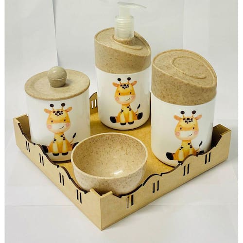 Kit higiêne de bebê Cor dos Potes: BRANCO Tampas: MADEIRA MATERIAL DA BANDEJA: MDF MATERIAL DOS POTES: ACRILICO Acomapanha: - 1 porta sabonete líquido/ porta álcool gel - 1 porta cotonete - 1 porta algodão - 1 molheira - 1 bandeja em MDF MEDIDAS DA BANDEJA EM MDF: Diâmetro: 19,5x19 cm Altura: 5x8cm MEDIDA DOS POTES: Porta algodão/cotonete: 8x10,5 cm Porta sabonete líquido: 12x21 cm Molheira: 8x5 cm Marca: Doya Kids Ean: 7898901266495