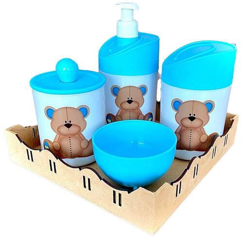Kit Organizador para bebê c/bandeja em MDF. Cor do Pote: BRANCO PADRÃO Tampas: AZUL MATERIAL DOS POTES: ACRÍLICO MATERIAL DA BANDEJA: MDF Kit acompanha: - 1 bandeja de madeira em MDF. - 1 porta sabonete / álcool gel - 1 molheira - 1 porta algodão - 1 porta cotonete MEDIDAS DA BANDEJA EM MDF: Diâmetro: 19,5x19 cm Altura: 5x8cm MEDIDA DOS POTES: Porta algodão/cotonete: 8x10,5 cm Porta sabonete líquido: 12x21 cm Molheira: 8x5 cm Marca: Doya Kids