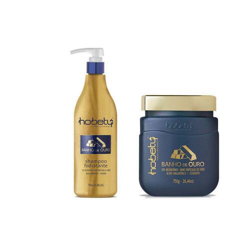 Kit Hobety Banho De Ouro Shampoo 750Ml + Mascara 750GrO Kit Banho de Ouro é um super tratamento de hidratação e recuperação da fibra capilar. Sua fórmula possui nano partículas de ouro, que promovem espelhamento e hidratação em todos os tipos de cabelos. Com ácido hialurônico proporciona uma melhor defesa contra agressões ambientais já que promove uma intensa hidratação, impedindo a perda de água; o colágeno ajuda a realinhar os fios, dando mais força e vitalidade também, proporcionando um aspecto mais saudável aos cabelos. Creatina, glicina e tirosina nutre e hidrata os fios. Sua ação restauradora corrige danos causados por outros produtos, compensando a necessidade de proteínas e nutrientes nas cutículas fragilizadas.Modo de usar:Lavar os cabelos com o Shampoo Banho de Ouro enxaguar e com eles úmidos aplicar uma quantidade da Máscara Banho de Ouro em todo o comprimento mecha a mecha enluvar bem delicadamente deixar agir por 10 minutos enxaguar e finalizar como preferir.O Kit Contém:01 Shampoo Banho de Ouro 750ml01 Máscara Banho de Ouro 750gr