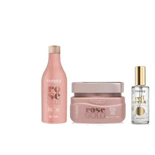 Kit hobety rose gold shampoo+máscara+finalizador oilreflectaRose goldTratamento para os cabelos fragilizados e quebradiços que precisam de crescimento e fortalecimento. Auxilia a saúde e a hidratação do couro cabeludo, estimulando a produção da queratina, para os fios já existentes, deixando-os macios, brilhantes e saudáveis.Modo de usar :Com os cabelos umidecidos ,aplique o shampoo rose gold massageando os fios em movimentos circulares , deixe agir por 5 minutos , enxague de forma abundante . Após o processo de lavagem aplique a máscara rose gold nos cabelos úmidos deixe agir por alguns minutos e enxaguar.Finalizador hobety oil reflecta 60mlFórmula enriquecida com 6 vitaminas , b1, b5, b6, c , e e k e sis minerais fósforo , zinco, magnésio ,sódio e cálcio que reunidos além de hidratar e nutrir , minimizam o ressecamento e fortalecem os fios .Reflecta é um finalizador que controla o frizz e contribui para a prevenção do alinhamento e da queda capilar auxiliando sua reposição de água .Mode de usar :Aplique algumas gotas do produto na palma da mão e aplicar nos fios secos ou molhados.Aut. Func.: 2.05.858.4