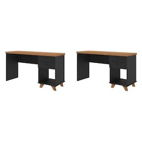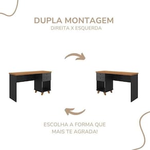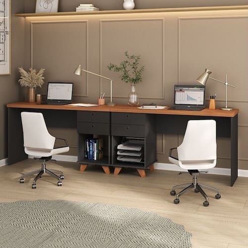 Transforme seu home office em um ambiente funcional e elegante com este conjunto de escrivanhas para duas pessoas. Com design moderno, acabamento em preto com tampo amadeirado e espaço otimizado, ele oferece praticidade para o dia a dia. Conta com gavetas, nichos e divisórias que facilitam a organização de documentos, livros e materiais de trabalho.