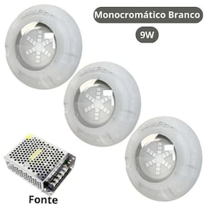 Kit de iluminação branco para piscina de até 48m - os refletores de 9w iluminam até 16m cada - refletor mais compacto do mercado, 7,5cm de diâmetro - este kit ilumina piscinas de até 48m Conteúdo do kit: 1 fonte chaveada 5a 60w 12v 3 refletores luxpool 9w 12v branco com cabo de 2m 3 dispositivos para encaixe em cano de 25mm 3 dispositivos para encaixe em cano de rosca bsp cônica Diâmetro: 7,5cmProfundidade: 5,9cmProfundidade corpo embutido: 3,6cmPeso: 0,300gr Imagens meramente ilustrativas Carrapeta, aqui tem qualidade Marca: Luxpool