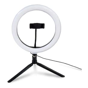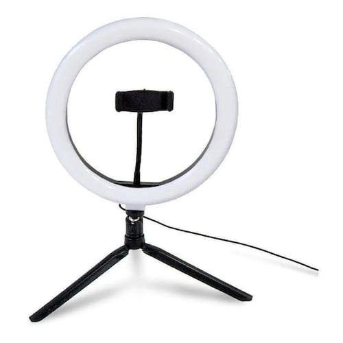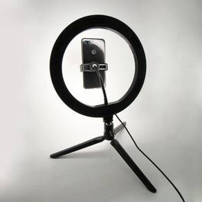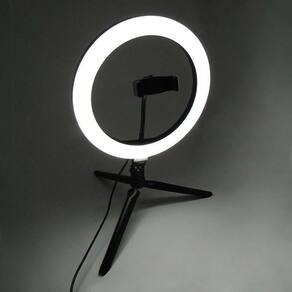 Informações técnicas Produto: Novo Marca: Exbom Modelo: ILUM-R12W16 Alimentação: 5V Usb (Não acompanha fonte Usb) Potência: 10 W Quantidade de lumens: 800 Lm Tipo de iluminação: Led Quantidade de leds: 162 Tamanho: 12 polegadas (30,0 cm) Temperatura mínima da cor: 3200 K (branco quente) Temperatura máxima da cor: 5600 K (branco frio) Formatos da luz: Aro Ajuste (controle) de cor: Sim Ajuste (controle) de iluminação (brilho): Sim Acessórios inclusos: Suporte para Smartphone Tripé: Não