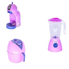 o kit vem com geladeira, microondas e fogão com panelas, air fryer, cafeteira com cápsula, batedeira, forminhas com acessório , liquidificador, potinhos para mantimentos, panelinha de pressão, xícaras e bulê, frutinhas que se dividem, comidinhas, louças