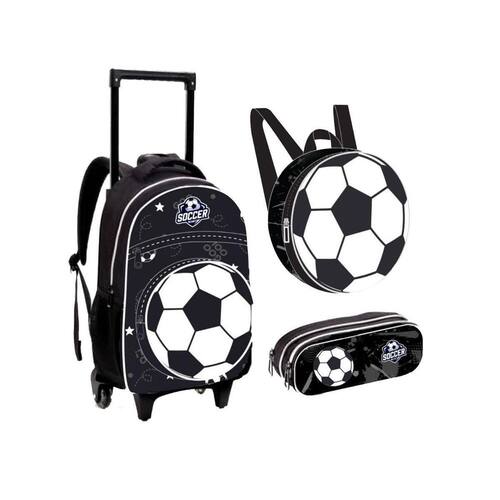 Kit Infantil Escolar Roda + Lancheira + Estojo Bola FTCK102 Mochila estampa exclusiva com compartimento super espaçoso e fechamento em zíper. Possui bolso frontal fundo com zíper, bolsos laterais em elástico, alças de costas acolchoadas e ajustáveis, puxador personalizado, carrinho com rodas deslizantes e pezinho de apoio, alça de mao fixa e acolchoada. Puxador leve em alumínio com ajuste de altura. acompanha lancheira térmica e estojo. Tamanho aproximado em cm: AxLxP 40x20x30 Altura do puxador 90cm