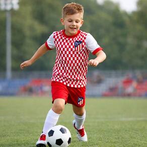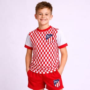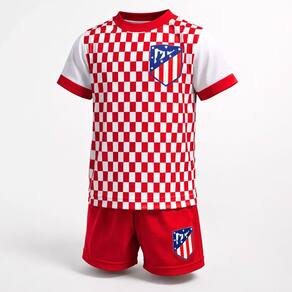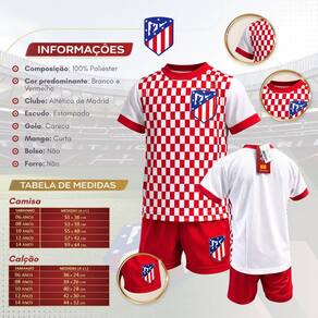 Características: - Composição: 100% Poliéster - Clube: Altético de Madrid - Escudo: Estampado - Origem: Nacional - Idade: Infantil - Manga: Curta - Gola: Careca - Bolso: Não - Forro: Não