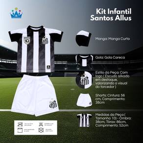 O Kit Infantil Santos Allus é a escolha perfeita para os pequenos que já demonstram a paixão pelo Peixe desde cedo. Com visual esportivo e moderno, o conjunto traz a identidade do Santos em destaque, ideal para acompanhar a criançada nas brincadeiras, passeios ou nos dias de jogo.