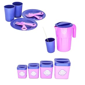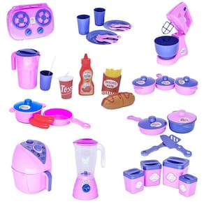 o kit vem com fogão cooktop, louça, jogo de panelas com talheres e comidinhas, batedeira, jarra com canudo, air fryer, liquidificador, potinhos de mantimentos e lanchinho