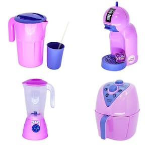 O Kit vem com Microondas com acessório sortido, Louça, Jogo de Xícara, Legumes e Frutas, Air Fryer, Cafeteira, Jarra, Jogo de Panela, Panelinha de Pressão, Liquidificador