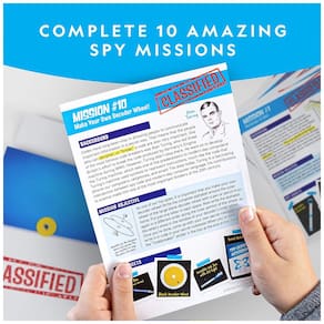 Conteúdo da embalagem: Rodas decodificadoras, periscópio, óculos retrovisor, caneta tinta invisível, caderno, adesivos, crachá, manual