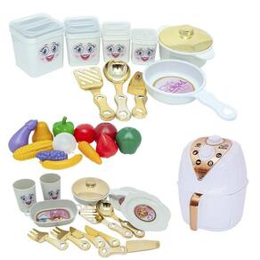 O kit vem com jogo de jantarzinho, jogo de mantimentos, air fryer, frutinhas e legumes