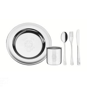 O Kit Infantil Tramontina Baby Friends para Refeição em Aço Inox 5 Peças é uma excelente opção para os pais que procuram produtos com a higiene do aço inox. Altamente duráveis e com formato ergonômico que facilita o uso, incentiva a autonomia e o desenvolvimento motor das crianças, o kit é parte da linha Baby Friends e possui acabamento em brilho com desenhos estampados em baixo relevo, acompanhando várias fases da infância. Para maior praticidade no dia a dia, o kit pode ser lavado na máquina de lavar louças. Orientações Totalmente feitos de aço inox, por isso não soltam nenhum resíduo nos alimentos, mantendo-os saudáveis. Altamente duráveis mantêm suas características autênticos, preservando a beleza, a higiene e a durabilidade do material. Talheres com formato ergonômico e com variação de desenhos, especialmente criados para incentivar e auxiliar no desenvolvimento das crianças. Acabamento em brilho, com desenhos estampados em baixo-relevo. Podem ser lavados diariamente na máquina de lavar louças. Material: aço inox. Características Gerais EAN13 7891116168790 DUN14 17891116168797 NCM 7323.93.00 Peso Líquido 0,3480 kg. Peso Bruto 0,5980 kg. Metragem 0,006417 m³. Dimensões Embalagem (Compr. X Larg. X Alt.) 295x 298x 73 mm. Observações Recomenda-se usar estes produtos para crianças com 36 meses ou mais. Use apenas sabão ou detergente e uma esponja macia. Outros tipos de produto como palha de aço, poderão riscar ou prejudicar o brilho das peças. Enxágue cada item a fim de remover totalmente os resíduos dos produtos de limpeza, que, por serem abrasivos, podem danificar o inox. Sempre que possível, use água quente, pois renova o brilho das peças. Após a lavagem, enxugue imediatamente as peças, caso contrário, as substâncias químicas da água (cloro) poderão causar manchas. Evite atrito entre as peças durante o processo de lavagem e no armazenamento, para mantê-las sem riscos. Evite o contato do produto com superfícies quentes, pois elas provocam a descoloração do material. Não guarde as peças em locais úmidos. A umidade também provoca manchas.