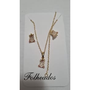 Este elegante kit infantil folheado a Ouro 18K contém um colar na cor dourada com um pingente dourado no formato de um unicórnio com 1 cm e 2 brincos em formato de unicórnio com 1 cm bijouterias feita em material com boa durabilidade e um brilho encantador. Com um design clássico e liso, é uma peça versátil que pode ser usada em diversas ocasiões, desde eventos formais até no dia a dia. Seu tamanho oferece um equilíbrio perfeito entre sutileza e magia infantil, adicionando um toque de charme e elegância ao visual da criança.