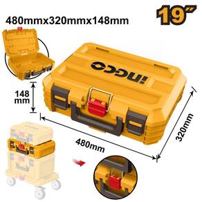 Produto ideal para otimização e organização das ferramentas, compatível para encaixe somente com as caixas de ferramentas Ingco modelos PBXS101 40cm e PBXS102 48cm e a base com rodas HHWB61001. Pode-se adquiri mais caixas para maior empilhamento e organização, sem restrição de quantidade de caixas empilháveis desde que não ultrapasse 100kg total. Facilita transporte.