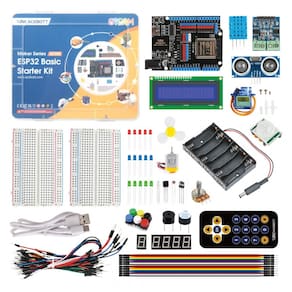 Conteúdo da caixa: Placa ESP32 Max V1.0, módulos e componentes eletrônicos diversos (como LEDs, sensores, etc.) e acesso a tutoriais detalhados