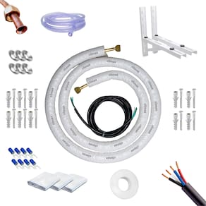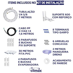 Itens inclusos:7 metros - Tubo de Cobre flexível 1/4" já Flangeadas7 metros - Tubo de Cobre flexível 5/8" já Flangeadas2 porcas de 1/4" em Latão (Colocados na Tubulação)2 porcas de 5/8" em Latão (Colocados na Tubulação7 metros - Isolamento Térmico Blindado 1/4"7 metros - Isolamento Térmico Blindado 5/8"7,60 metros - Cabo PP Flexível com 4x1,5mm 8 Terminais Tipo Garfo 30 metros - Fita de PVC branca4 Parafusos Nº 8 Philips para a fixação da evaporadora4 Buchas Nº 8 FU para a fixação da evaporadora1 Acabamento de parede Ø 55mm1 Par suporte 60 cm de metal (Compatível com Condensadora Redonda e Retangular)4 Parafusos com porcas e arruelas do suporte4 Amortecedores da unidade condensadora6 Parafusos Nº 10 Sextavados para a fixação do suporte6 Buchas nº 10 FU para a fixação do suporte 6 Arruelas 2 Metros mangueira de dreno Qualquer duvida estamos a disposição!