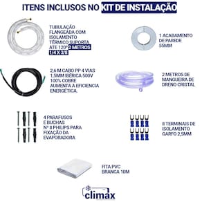 Itens inclusos: 2 metros - Tubo de Cobre flexível 1/4" já Flangeadas 2 metros - Tubo de Cobre flexível 3/8" já Flangeadas 2 porcas de 1/4" em Latão (Colocados na Tubulação) 2 porcas de 3/8" em Latão (Colocados na Tubulação 2 metros - Isolamento Térmico Blindado 1/4" 2 metros - Isolamento Térmico Blindado 3/8" 2,60 metros - Cabo PP Flexível com 4x1,5mm 10 metros - Fita de PVC branca 4 Parafusos Nº 8 Philips para a fixação da evaporadora 4 Buchas Nº 8 FU para a fixação da evaporadora 1 Acabamento de parede Ø 55mm 2 metros mangueira de dreno
