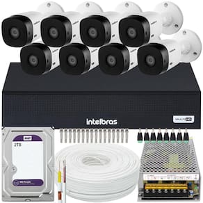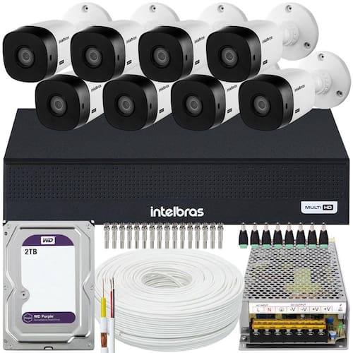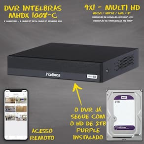acesso via smartphone E computadorCONTEÚDO01 dvr intelbras mhdx 1008c 5X1 de 08 canais com HD interno de 2TB wd purple08 câmeras intelbras 1010 B full hd01 fonte eletrônica chaveada 12V 10A bivolt01 caixa com 100 metros de cabo coaxial flexível 4MM 80% de malha16 conectores bnc antirruído parafuso E mola08 conectores P4 macho com borne01 mouse usbCARACTERÍSTICASdvr de 08 canais intelbras mhdx 1108- modelo: mhdx 1108.- tecnologias: 5X1 (hdcvi + hdtvi + ahd + analógica + ip).- quantidade de canais: 8 canais bnc + 2 canais ip ou 10 canais ip no modo nvr.- resolução de gravação / visualização: 1080p, 1080p Lite ou 720p.- conexão de rede: Compati'vel com redes Wi-Fi atrave's de adaptador USB (vendido separadamente) e cabo RJ45 (10/100 m).- saídas de vídeo: vga, hdmi e bnc.- inteligência de vídeo: Edição de áudio e vídeo / Detecção de movimento.- modo de gravação: Suporta 1 HD sata interno de até 12 tb.- acesso remoto: Nuvem e ddns sem custo.- aplicativo de acesso remoto: isic Lite.