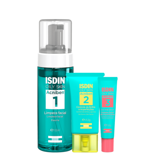 Kit ISDIN Acniben Skincare promove controle da oleosidade e da acne, com espuma de limpeza facial, gel secativo e gel creme para pele oleosa e acneica.