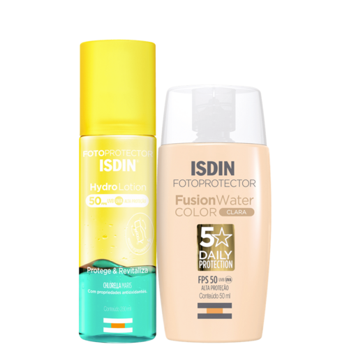 Kit com protetores solares para rosto e corpo. ISDIN Fusion Water 5 Stars Color Clara + HydroLotion protege contra os raios solares, auxilia no controle da oleosidade e revitaliza a pele.