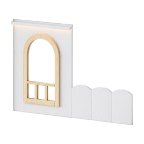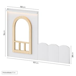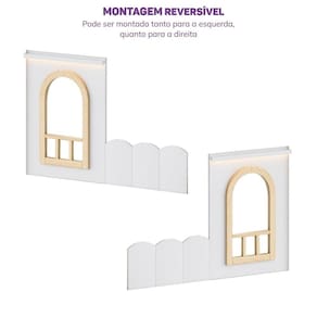 Kit Janela com Cerquinha para Beliche Montessoriana New Garden Casatema Branco/Natural. Transforme o espaço do seu pequeno com o Kit Janela e Cerquinha da New Garden, um acessório encantador para a Beliche Infantil Montessoriana New Garden. Este complemento foi cuidadosamente projetado para oferecer um ambiente lúdico e aconchegante, estimulando a imaginação e a sensação de segurança. A janela é equipada com uma fita de LED Quente, emitindo uma luz quente e suave que cria um clima relaxante e acolhedor para a hora de dormir ou de brincar. Fabricado em MDF com pintura laqueada na cor branca e detalhes em madeira maciça, este kit garante durabilidade e um acabamento elegante que combina facilmente com qualquer decoração. A fixação é feita por parafusos, assegurando estabilidade e segurança. Além disso, a peça é versátil e pode ser montada tanto no lado direito quanto no lado esquerdo da cama inferior. Com a possibilidade de montagem invertida, você tem ainda mais flexibilidade para adaptar o layout do quarto conforme a necessidade. O design inteligente e o calor do LED proporcionam um toque especial e funcionalidade extra ao mobiliário, transformando a cama em um verdadeiro refúgio de sonhos.