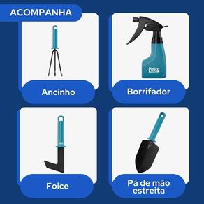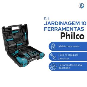 Com o Kit Jardinagem Philco PKJ10 o momento de cuidar das suas plantas e do seu jardim será mais fácil e prazeroso. Ele é composto por 10 ferramentas, perfeitas para diferentes atividades na hora de realizar a manutenção dos espaços. Acompanha maleta com travas para você guardar todos os acessórios, manter organizado e ter mais facilidade e segurança ao transportar e cuidar das suas plantinhas. As ferramentas do Kit Jardinagem são em aço e possuem cabo em plástico de alta resistência com furo na alça para pendurar, o que as torna mais leves, práticas e fáceis de serem manuseadas. O Kit Jardinagem Philco PKJ10 é ideal para quem ama jardinagem ou que deseja cuidar das suas plantas, hortas e temperos com as próprias mãos e com menos esforço físico. -acompanha 10 acessórios para atividades de jardinagem; -cabo dos acessórios em plástico de alta resistência; -acompanha maleta para armazenamento dos acessórios; -acessórios: 1 ; 1 mini rastel de 4 pontas; 1 Ancinho de 3 pontas; 1 mini pá larga; 1 mini pá estreita; 1 pá de mão estreita; 1 pá de mão larga; 1 tesoura para folhas; 1 tesoura para poda; borrifador de 170ml. -A , as pás de mão e o ancinho possuem furo na alça para pendurar. Medidas: 20cmX30cmX7cm, 1,35kg