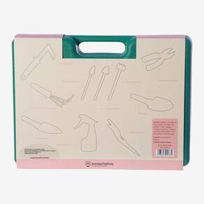 Kit Jardinagem Quem Planta Amor Colhe Felicidade Zona Criativa Você é a pessoa doida das mudinhas Não pode ver uma plantinha diferente que já quer levar para casa Chegou o seu momento de brilhar Com esse kit as suas mudinhas crescem e se transformam em lindas flores Não importa qual o tipo de muda, com esse kit tudo floresce O produto é , possui detalhes incríveis que vão fazer você se apaixonar Se você ama plantinhas e sempre quis ter um jardim, a gente te ajuda Esse kit tem tudo o que você precisa para cuidar e transformar suas mudinhas em um verdadeiro jardim Feito em aço carbono e plástico, esse kit vai transformar o seu momento verde do dia Não importa qual é a planta, esse kit te acompanha em todas as suas aventuras Itens inclusos: 1 Maleta 1 Ancinho de Três Pontas 1 Pá Larga 1 Pá estreita 1 Pequena 1 Tesoura de Grama 1 Tesoura para Poda 1 Borrifador 1 Mini Pá Estreita 1 Mini Pá Larga Material: Aço carbono e Plástico Cuidados e recomendações de uso: Manter fora do alcance de crianças. Quedas podem danificar o produto. Limpar com água corrente e sabão neutro.