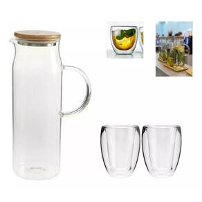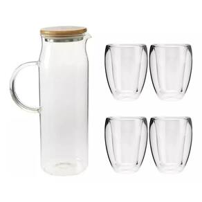 KIT Jarra De Suco Com Tampa Bambu Vidro Borossilicato 1,5 L + 04 Copos Cha Dupla Parede Barista