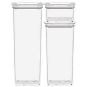 Kit jogo 3 potes herméticos encaixáveis organizador cozinha Organize do seu jeito e conquiste a despensa perfeita com o kit de 3 potes herméticos modo coza. Produzido em poliestireno na cor cristal, oferece o brilho e a elegância do vidro, combinados com resistência e durabilidade. Seu sistema de encaixe não apenas otimiza espaço, mas também proporciona versatilidade, com inúmeras opções de empilhamento, seja de potes maiores sobre os menores ou retangulares acima dos quadrados e vice-versa. A vedação hermética impede vazamentos e a entrada de ar, mantendo frescor e qualidade. O kit possui 3 potes com capacidades de 1,8l, 1,5l e 230ml. Livre de bpa e fácil de limpar, o kit de potes não é adequado para micro-ondas, freezer ou lava-louças