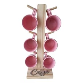 Kit Jogo 6 Xícara Rosa Café Suporte Madeira Mesa Cozinha