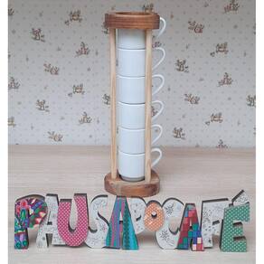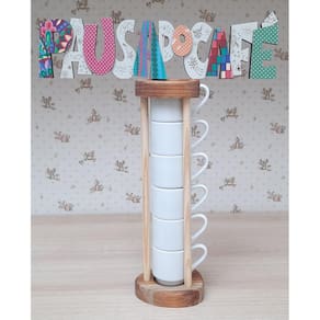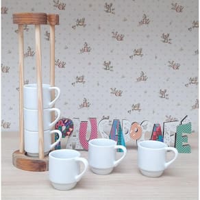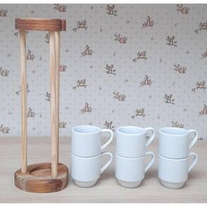 Kit Jogo 6 Xicaras Café hotel 80ml Empilháveis c/ suporte pinus e teca - Porcelana Branca