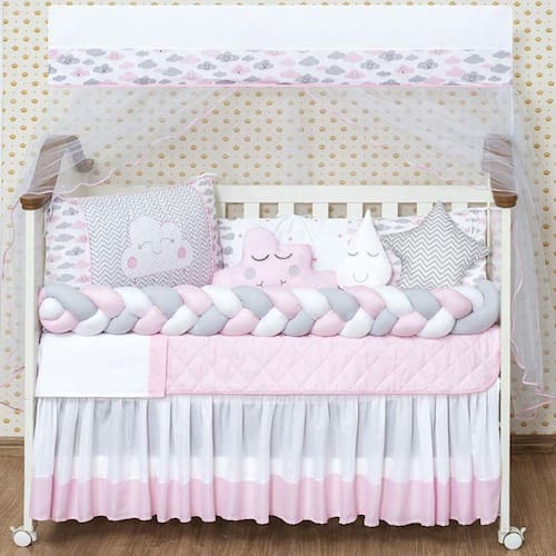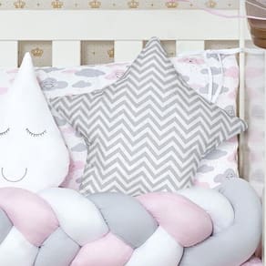 Kit Jogo Berço Para Menina 12 Peças Nuvem Rosa Com Saia BoxContém na embalagem:1 edredom 1,30 m x 0,75 cm1 almofada nuvem 0,40 cm x 0,20 cm1 cabeceira 0,57 cm x 0,37 cm1 lateral 1,25 m x 0,25 cm1 trança 1,25 m x 0,12 cm1 lençol de cima 1,30 m x 0,90 cm1 fronha 0,28 cm x 0,38 cm1 bandô de mosqueteiro 1,40 m x 0,20 cm1 mosqueteiro 4,50 m x 1,50 m1 almofada de gota1 saia box 1,30 m x 0,70 cm.1 almofada formato estrela;Observação:Kit de berço que serve em berços padrão nacional e americanoPossui zíper para retirar os enchimentosTecido de qualidadeComposição:Tecido estampado: 100% algodãoTecido liso: 50% poliéster / 50% algodãoEnchimento = 100% poliésterMosquiteiro = 100% poliamida