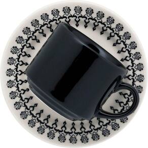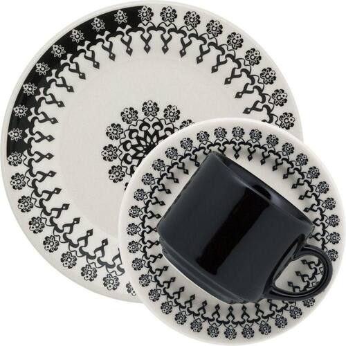 A cor preta é básica e neutra, um verdadeiro curinga na hora de montar a mesa. Nessa louça, colocamos a cor preta numa estampa mais alegre e jovial, perfeita para quem prefere um formato de pratos tradicional com uma decoração mais alegre. A xícara preta, sem decoração, cria uma linda composição com as demais peças.