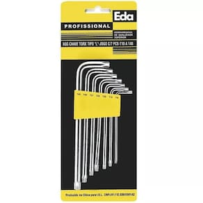 Jogo chave torx tipo L c/7 peças 8QG O jogo de chave Torx tipo L devido o formato Estrela de sua ponta permite apertar e soltar parafusos sextavados. Podendo ser utilizada em diversos meios como oficina, indústria, empresa e residência. Descrição do Produto: - Marca: EDA, - Modelo: 8QG, - Com Suporte plástico, - Chaves com Furo, - 7 Chaves L: T10, T15, T20, T25, T27, T30 e T40, - Comprimento da menor chave: 7 cm, - Comprimento da maior chave: 14 cm, - Peso: 152 mm. Aplicações: - Moto, - Carro, - Bicicletas, - Motores, - Residência, - Entre outros.