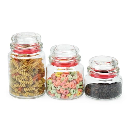 Kit Jogo com 3 Potes de Vidro com Vedação p Mantimentos Kit com 3 potes de vidro com vedação, guarde mantimentos, doces, condimentos e muito mais, por possui vedação preserva o sabor e aromar por mais tempo, os potes são feitos de vidro de grossa espessura que dá um toque de robustez e resistência aos potes.