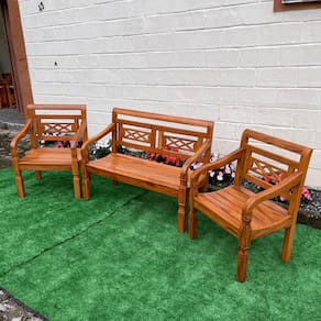O Conjunto com 1 Banco 2 Poltronas em Madeira de Demolição é para você que procura uma peça bonita e campestre. Altamente resistente e durável, é um item em estilo rústico com entalhos de X no encosto, proporcionando elegância e um diferencial ao seu ambiente. A peça é produzida em madeira de demolição com acabamento em verniz, dando mais resistência e durabilidade no produto. Deixe sua casa ainda mais bonita sofisticada com o Conjunto com 1 Banco e 2 Poltronas da Sudeste Rústico.