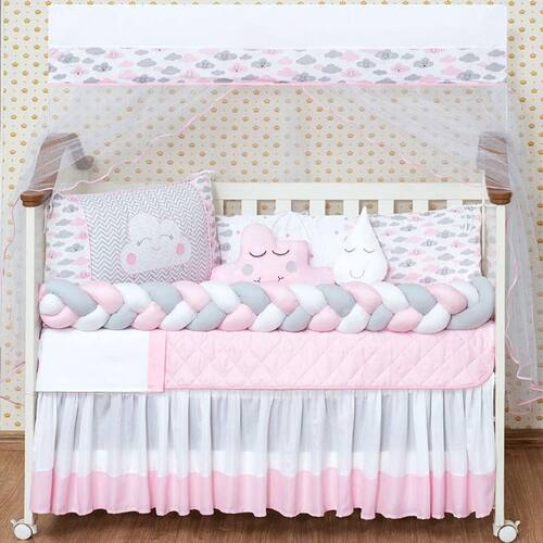 Kit de berço nuvem 13 peças O kit berço serve em berços padrão nacional e americano Possui zíper para retirar os enchimentos Contém na embalagem: 1 edredom 1,30 m x 0,75 cm 1 almofada nuvem 0,40 cm x 0,20 cm 1 cabeceira 0,57 cm x 0,37 cm 1 lateral 1,25 m x 0,25 cm 1 trança 1,25 m x 0,12 cm 1 lençol de cima 1,30 m x 0,90 cm 1 fronha 0,28 cm x 0,38 cm 1 bandô de mosqueteiro 1,40 m x 0,20 cm 1 mosqueteiro 4,50 m x 1,50 m 1 almofada de gota 1 saia box 1 lençol 1,20 m x 0,80 cm 1 protetor de colchão impermeável 1,30 m x 0,70 cm Composição: Tecido estampado: 100% algodão Tecido liso: 50% poliéster / 50% algodão Enchimento = 100% poliéster Mosquiteiro = 100% poliamida Marca: Não Informado