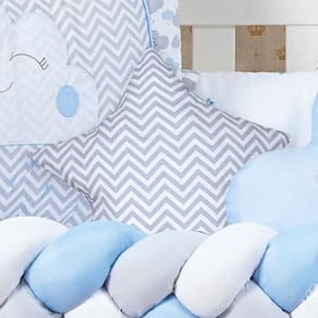 Kit Jogo De Berço Menino Nuvem Com Saia Box Azul E Estrela Kit Berço Trança Com Saia Box e Estela 12 Peças Contém na embalagem: 1 edredom 1,30 m x 0,75 cm 1 almofada nuvem 0,40 cm x 0,20 cm 1 cabeceira 0,57 cm x 0,37 cm 1 lateral 1,25 m x 0,25 cm 1 trança 1,25 m x 0,12 cm 1 lençol de cima 1,30 m x 0,90 cm 1 fronha 0,28 cm x 0,38 cm 1 bandô de mosqueteiro 1,40 m x 0,20 cm 1 mosqueteiro 4,50 m x 1,50 m 1 almofada de gota 1 saia box 1,30 m x 0,70 cm. 1 almofada formato estrela; Observação: Kit de berço que serve em berços padrão nacional e americano Possui zíper para retirar os enchimentos Tecido de qualidade Composição: Tecido estampado: 100% algodão Tecido liso: 50% poliéster / 50% algodão Enchimento = 100% poliéster Mosquiteiro = 100% poliamida