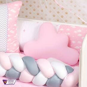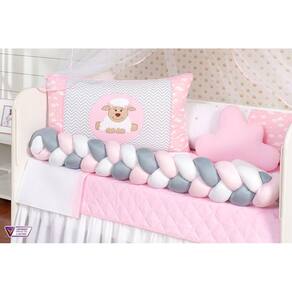 KIT BERÇO OVELHA 14 PEÇAS Contém: 1 Edredom 1,30 m x 75 cm 1 Almofada nuvem 40 cm x 20 cm 1 Travesseiro 100% algodão 40 cm x 30 cm. 1 Cabeceira 57 cm x 37 cm 1 Lateral 1,25 m x 25 cm 1 Trança 1,25 m x 12 cm 1 Lençol de cima 1,30 m x 90 cm 1 Fronha 28 cm x 38 cm 1 Bandô de mosqueteiro 1,40 m x 20 cm 1 Mosqueteiro 4,50 m x 1,50 m 1 Trocador 60 cm 40 cm. 1 Lençol 1,20 m x 70 cm. 1 Saia box 1,30 m x 70 cm x 30 cm. 1 Travesseiro 100% Algodão 0,40 cm x 0,30 cm. Observação: Kit de berço que serve em berços padrão nacional e americano Possui zíper para retirar os enchimentos Tecido de qualidade Composição: Tecido estampado: 100% algodão Tecido liso: 50% poliéster / 50% algodão Enchimento: 100% poliéster Mosquiteiro: 100% poliamida Travesseiro: 100% algodão / fibra silicone
