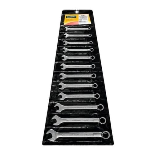 Kit Jogo De Chaves Combinadas 6Mm A 22Mm TramontinaAs aberturas das bocas das chaves de aperto são verificadas com gabaritos calibrados, o que garante seu perfeito acoplamento nos parafusos;As ferramentas são produzidas e testadas conforme normas específicas;Corpo forjado em aço especial e temperado;Acabamento cromado;Medidas: 06 mm, 07 mm, 08 mm, 09 mm, 10 mm, 11 mm, 12 mm, 13 mm, 14 mm, 17 mm, 19 mm, 22 mm;Cor: Prata;Marca: Tramontina.
