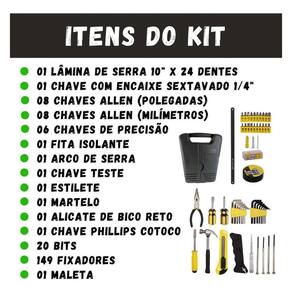 Kit Jogo De Ferramentas Com Maleta 200 Peças Perfeita para quem busca versatilidade, praticidade e organização em um único kit. Ideal para ou doméstico, ela inclui uma ampla variedade de ferramentas como chaves, bits, alicates, martelo, estilete e muito mais, atendendo desde pequenos reparos até manutenções mais complexas. Com maleta resistente e bem organizada, facilita o e o armazenamento, além de contar com ferramentas fabricadas com materiais de alta qualidade, garantindo durabilidade e desempenho no dia a dia. Seja você mecânico, eletricista, instalador ou entusiasta do faça você mesmo, Itens Inclusos: - 01 LÂMINA DE SERRA 10 X 24 DENTES - 01 CHAVE COM ENCAIXE SEXTAVADO 1/4 - 08 CHAVES ALLEN (POLEGADAS) - 08 CHAVES ALLEN (MILÍMETROS) - 06 CHAVES DE PRECISÃO - 01 FITA ISOLANTE - 01 ARCO DE SERRA - 01 CHAVE TESTE - 01 ESTILETE - 01 MARTELO - 01 ALICATE DE BICO RETO - 01 CHAVE PHILLIPS COTOCO - 20 BITS - 149 FIXADORES - 01 MALETA