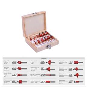 - 1 Rasgo em V 12,7mm 90c - 1 Rasgo em U 12,7mm Raio 6,3mm . - 1 Rabo de Andorinha 12,7mm 14c . - 1 Moldura Arredondada com Rolamento 22mm Raio 6,3mm . - 1 Chanfro com Rolamento 32mm 45c . - 1 Moldura Romana com Rolamento 25mm Raio 4mm . - 1 Reta para Acabamentos e Frisos 6mm - 1 Reta para Acabamentos e Frisos 12mm - 1 Reta para Acabamentos e Frisos 16mm - 1 Quebra Canto com Rolamento 22mm Raio 6,3mm - 1 Quebra canto com Rolamento 28,6mm Raio 9,5mm . - 1 Acabamento de Lâminas com Rolamento 12,7mm