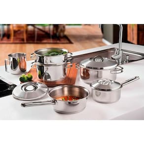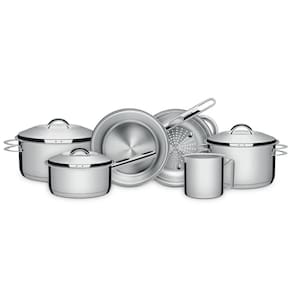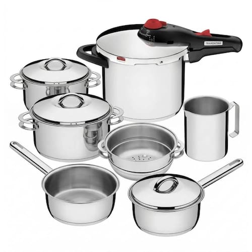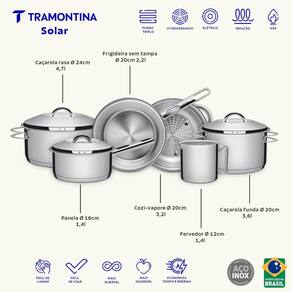 O Kit Jogo de Panelas Tramontina Solar 7 Peças em Aço Inox para Indução é a escolha ideal para quem busca qualidade, durabilidade e sofisticação na cozinha. Fabricado no Brasil, o conjunto é composto por 1 panela Solar de 16 cm (1,4 L), 1 caçarola rasa Solar de 24 cm (4,7 L), 1 caçarola funda Solar de 20 cm (3,6 L), 1 cozi-vapore Solar de 20 cm (3,2 L), 1 frigideira Allegra de 20 cm (2,2 L), 1 fervedor Allegra de 16 cm (1,4 L, sem fundo triplo) e 1 panela de pressão Solar de 6 litros, oferecendo versatilidade para o preparo das mais diversas receitas. As peças possuem fundo triplo (aço inox + alumínio + aço inox), que distribui o calor de maneira uniforme, garantindo um cozimento mais rápido, eficiente e econômico, além de manter os alimentos aquecidos por mais tempo. Compatíveis com fogões por indução, também podem ser utilizadas em outros tipos de fogão. Seu acabamento em alto brilho proporciona elegância e modernidade à cozinha, enquanto o design sem cantos facilita a limpeza, podendo inclusive ser levadas à máquina de lavar louças diariamente. Um conjunto completo que une desempenho, praticidade e beleza para o dia a dia.